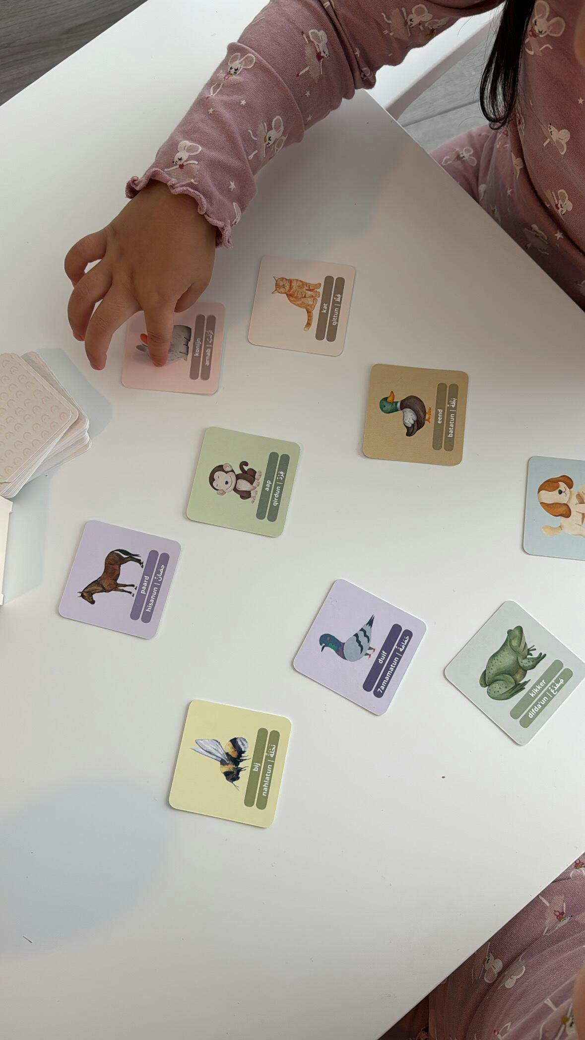 Islamitische taal/memory kaarten – Dieren Editie is een speels en liefdevol ontworpen kaartspel waarmee kinderen op een natuurlijke manier dieren leren herkennen en benoemen in het Nederlands en in het Arabisch.